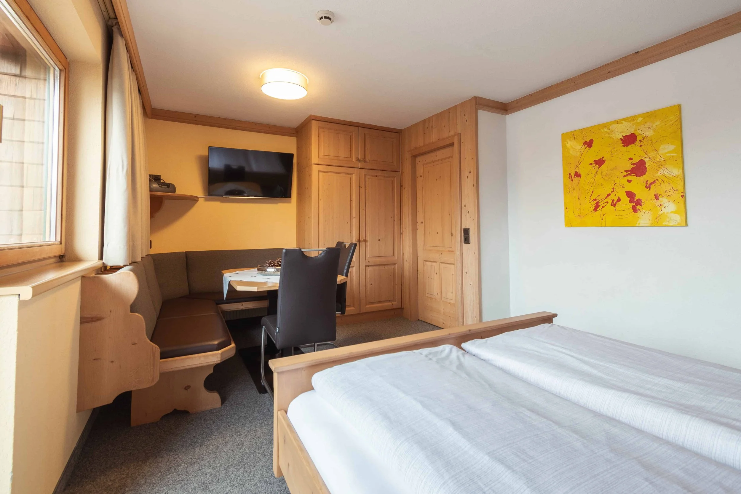 • Wohn-und Schlafzimmer mit Esstisch, Kleiderschrank und TV-Gerät
