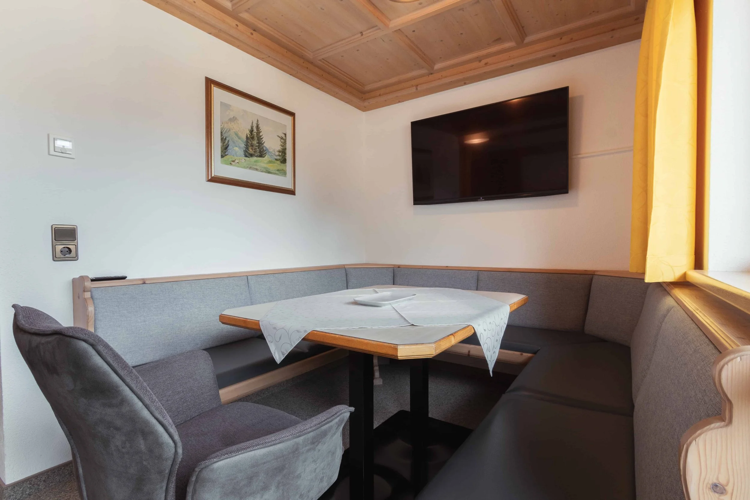 • Wohn-und Schlafzimmer mit Esstisch, Kleiderschrank und TV-Gerät